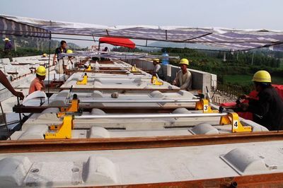 ②、鋼軌高低位置負(fù)調(diào)整時(shí),應(yīng)先卸下錨固螺栓,提升鋼軌。